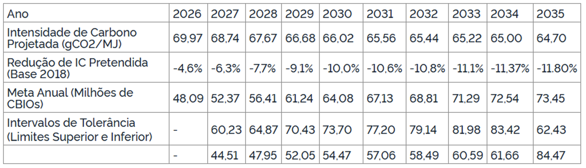 As metas propostas abrangem o decênio de 2026 a 2035, com a definição do seguinte cronograma anexo à norma: